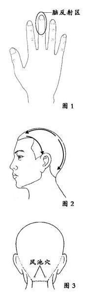 用刮痧梳按侧头部、头顶部、后头部的顺序刮拭全头(如图2),可着重刮脑后风池穴(如图3),刮至头皮发热即可,注意寻找并重点刮拭疼痛点。经常刮拭全头和中指背对头部具有保健作用,可以改善大脑缺氧,预防脑血管疾病,延缓大脑衰老。