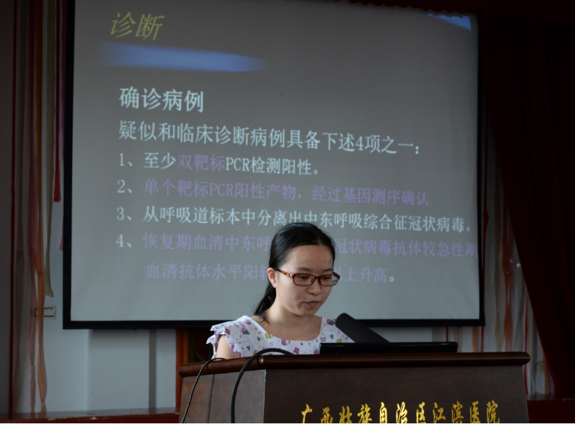 为了提高我院医务人员对中东呼吸综合征的认知程度,医院感染管理科于 2015年6月24日下午对全体医务人员进行了中东呼吸综合征疫情防控知识的培训。培训的主要内容有:中东呼吸综合征病例的诊疗方案、疫情的防控方案、医院感染的预防和控制,并根据我院实际情况,着重讲解了我院对冠状病毒感染病例的发现及报告流程。通过加强对医务人员的培训,提高医务人员对中东呼吸综合征医院感染预防与控制的意识和工作水平,做到早发现、早诊断、早报告、早隔离、早治疗。
